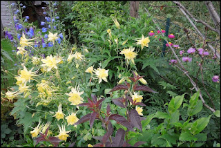 Tra queste due perenni c'è un'aiuola composta da piante ingombranti che non sono ancora fiorite per bene ( tranne l'Aquilegia chrysantha 'Yellow Queen') ma che ho fotografato perchè rendono l'idea di quello che volevo creare quando ho messo a dimora le piante: un piccolo bosco fitto dove ogni pianta ha uno spazio ottimale per crescere anche se tutto sembra compresso.